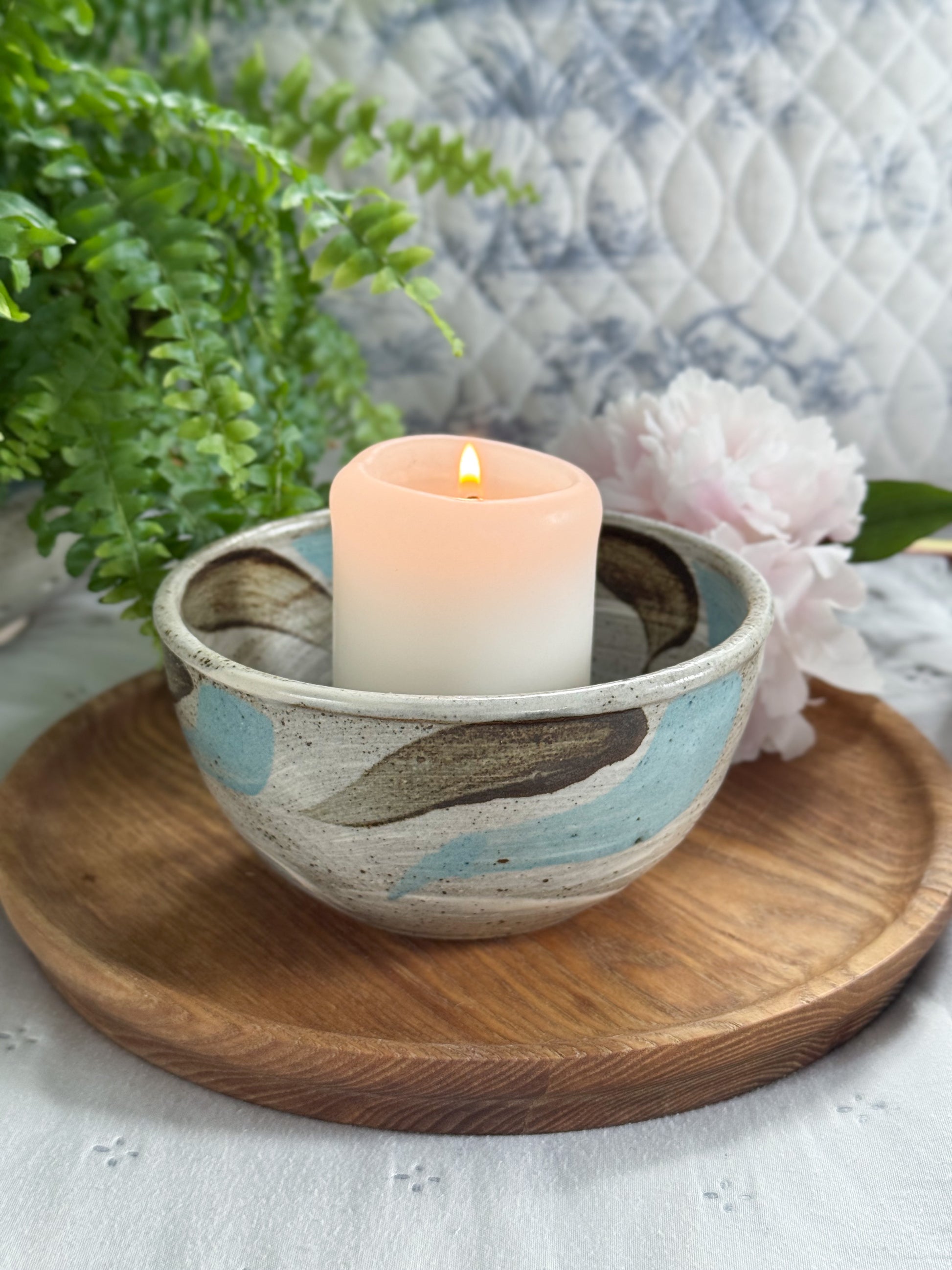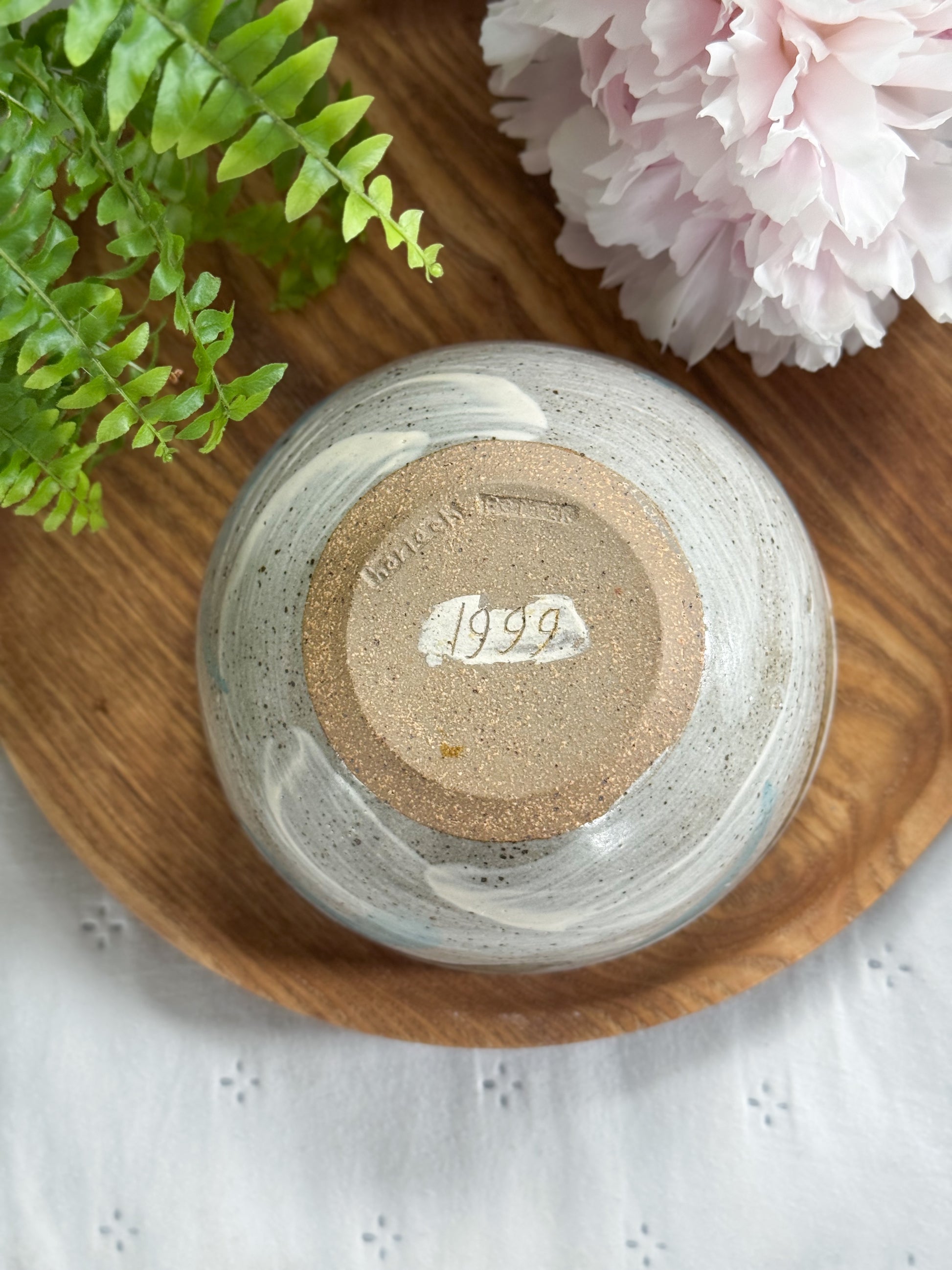 This beautiful studio pottery bowl was handmade in North Wales by Harlech Pottery and is dated 1999 on the base. I was drawn to the soft, painterly quality of the sweeping brushstrokes, pale blue and earthy brown on a speckled stoneware background, it reminds me of the sea. Inside, the spiral of the wheel is still visible, a quiet reminder of the hands that shaped it.