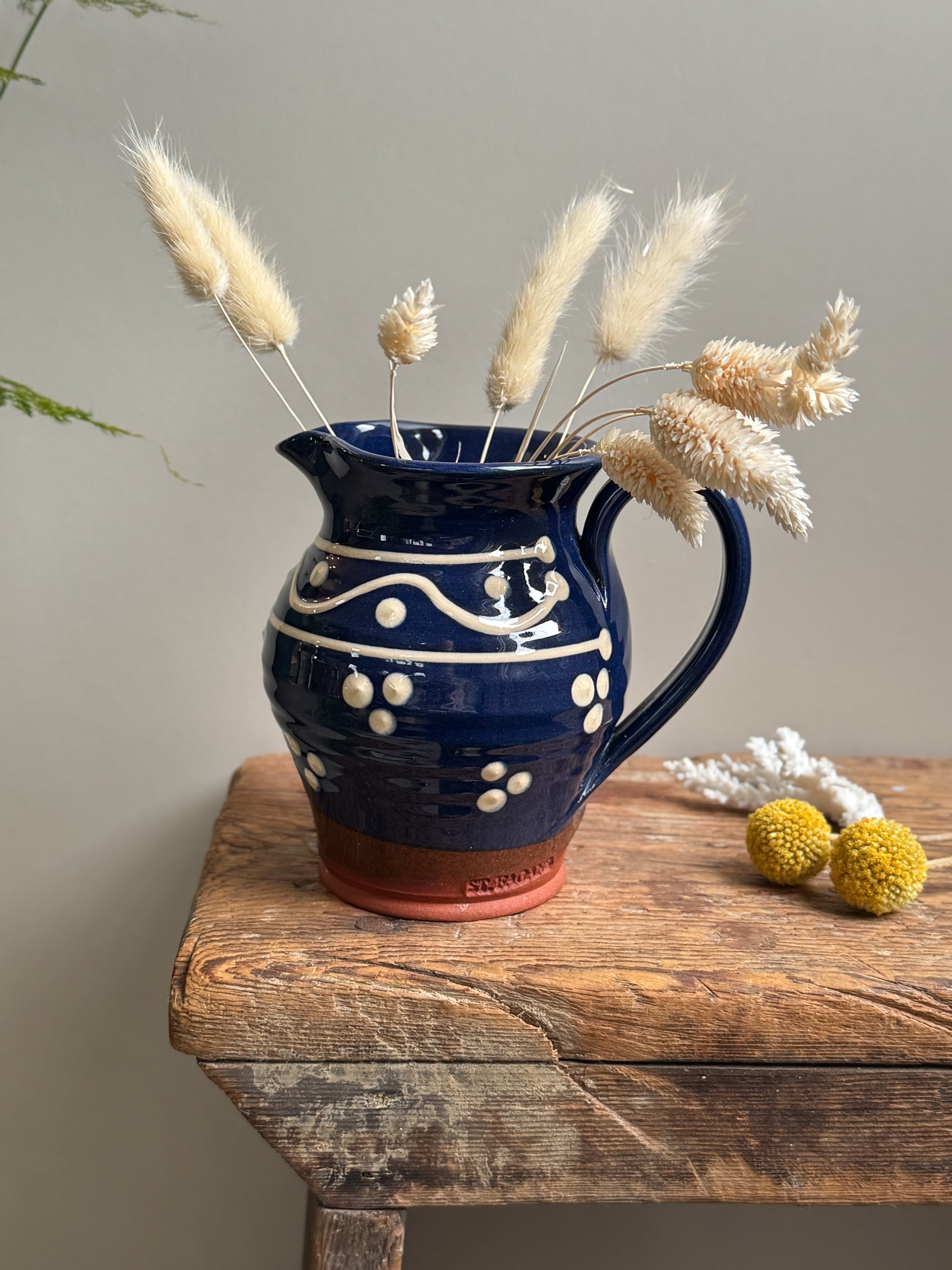 This joyful little jug features a rich midnight cobalt glaze with creamy slip-trailed decoration in a playful, folk-art floral pattern. The warm terracotta base, clearly stamped ST. FAGANS, grounds the piece in its Welsh roots and gives that perfect contrast of earth and colour that makes slipware so beloved.