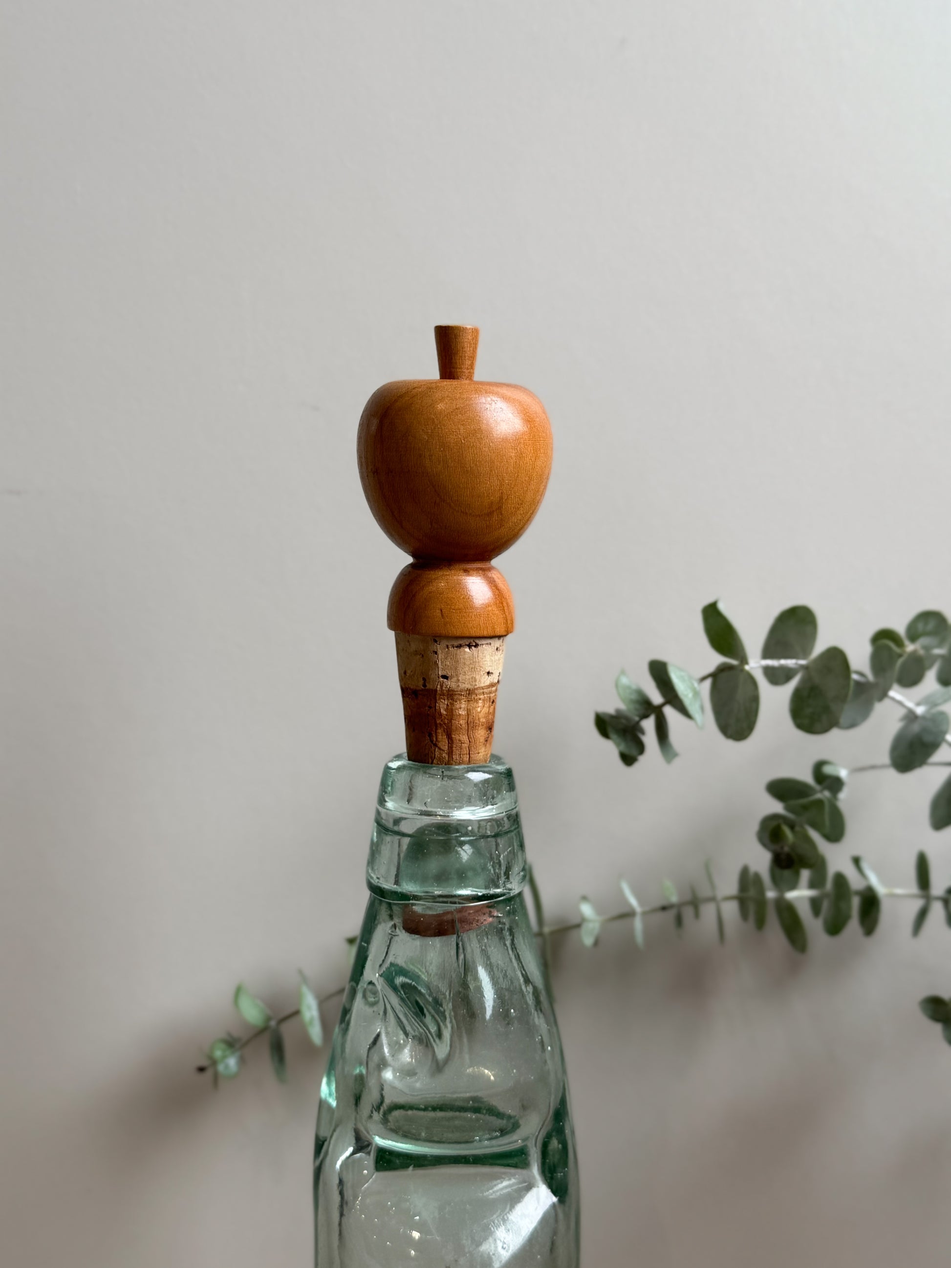 A sweet vintage bottle stopper carved from wood in the shape of an apple, complete with a natural cork base. Simple yet full of character, it’s the kind of everyday object that brings a little charm and warmth to the table.
