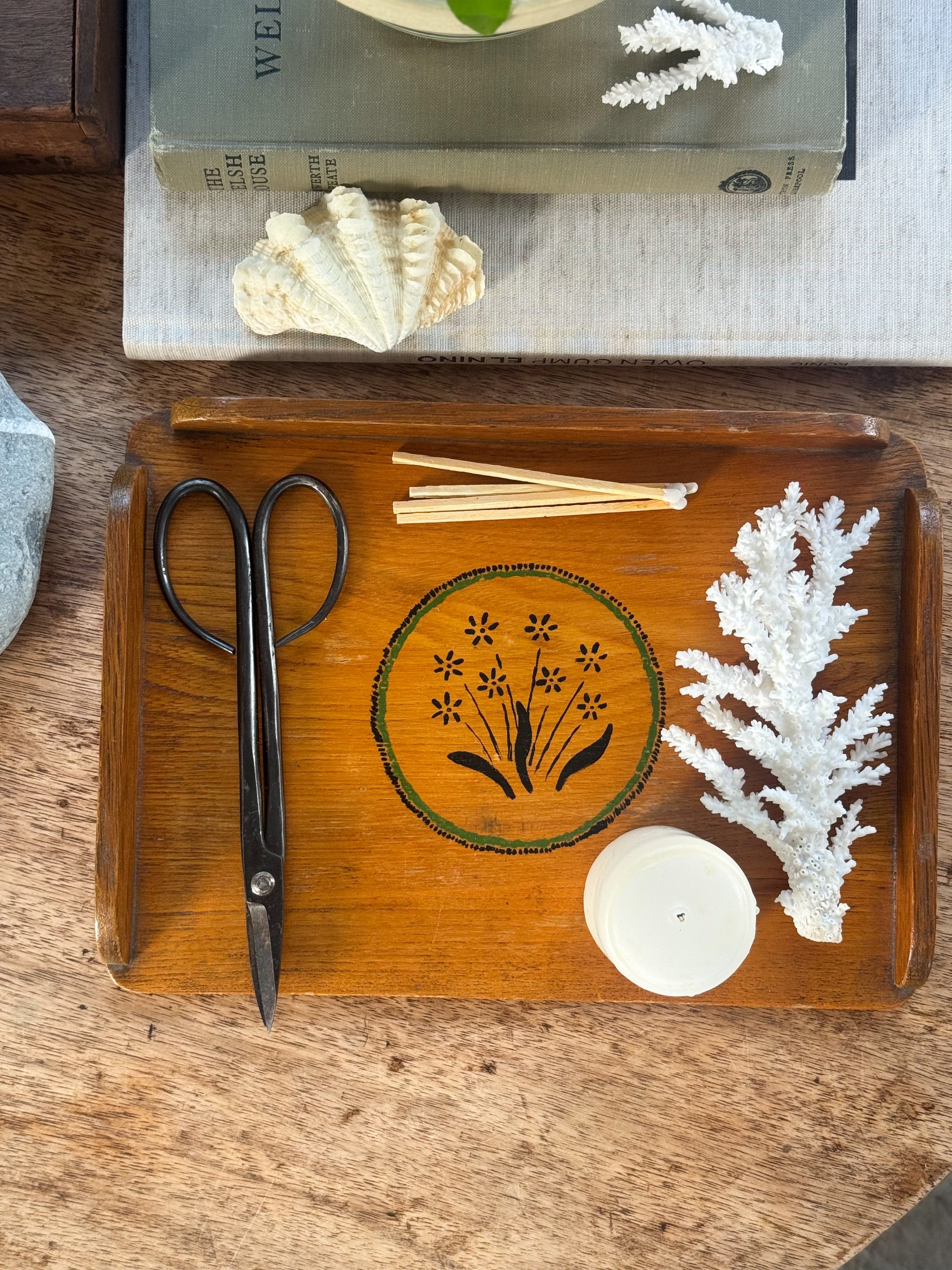 The wood has a rich honeyed tone and a naturally worn finish that speaks to decades of use and quiet domestic rituals. It’s the perfect size for serving coffee, displaying candles, or creating a styled moment on a bedside or coffee table.