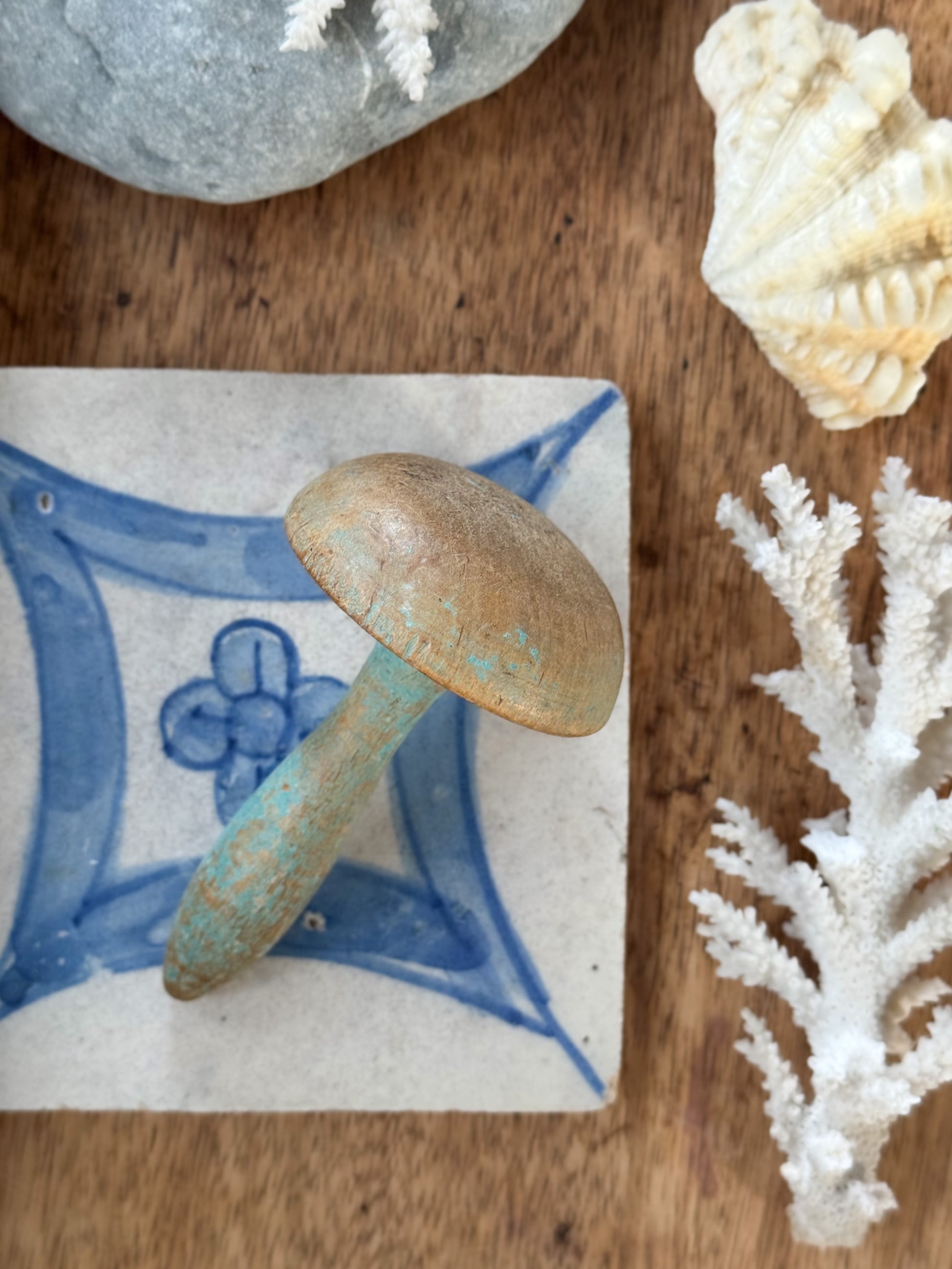 A beautifully timeworn vintage wooden darning mushroom, once used for mending socks and knitwear, a humble and practical tool now full of charm and character. Its surface is worn smooth from years of use, and the handle still shows traces of the most perfect blue chippy paint, soft and faded in all the right places.