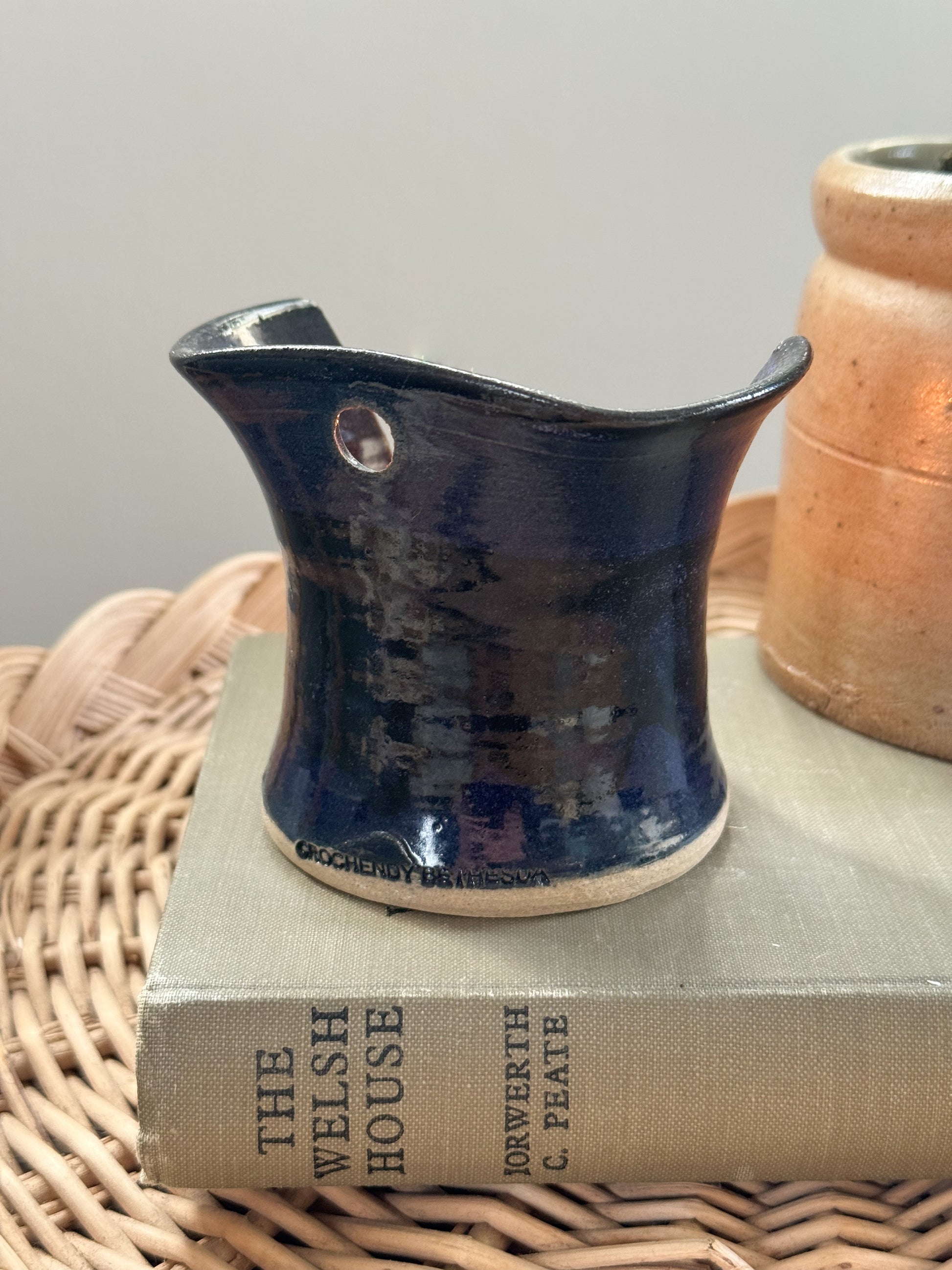 A stunning studio pottery wall-mounted candle holder, handmade by Crochendy Bethesda in North Wales. Glazed in a deep, glossy cobalt blue with a contrasting unglazed base, this piece blends function and craftsmanship beautifully. Its curved, sculptural form creates a warm glow when lit, casting gentle light across the wall, the kind of detail that makes a home feel lived in and loved.